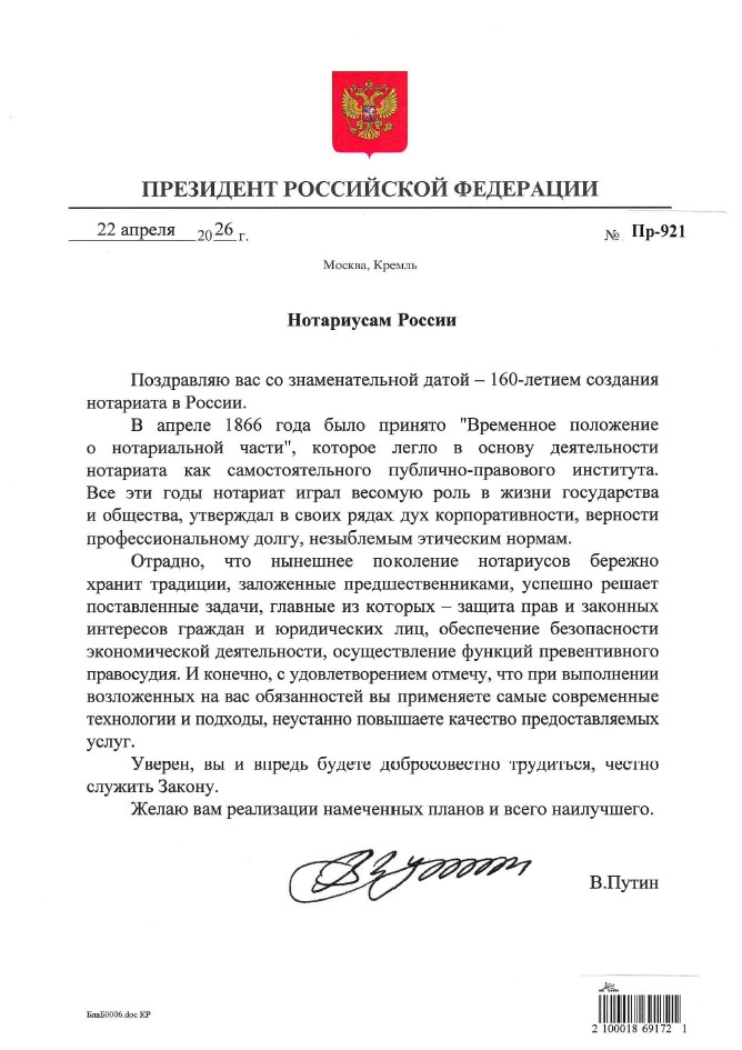 С юбилейной датой нотариусов поздравил Президент России Владимир Путин, подчеркнув весомую роль нотариата в жизни государства и общества, верность представителей нотариального сообщества профессиональному долгу и незыблемым этическим нормам.