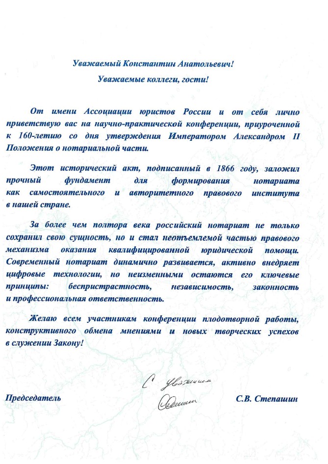 160-летний юбилей служит подтверждением доверия граждан и государства к нотариату, указал в своем поздравительном адресе директор Федеральной службы судебных приставов — главный судебный пристав РФ Дмитрий Аристов. И это доверие нотариусы оправдывают профессионально выполненной работой, подчеркнул он.