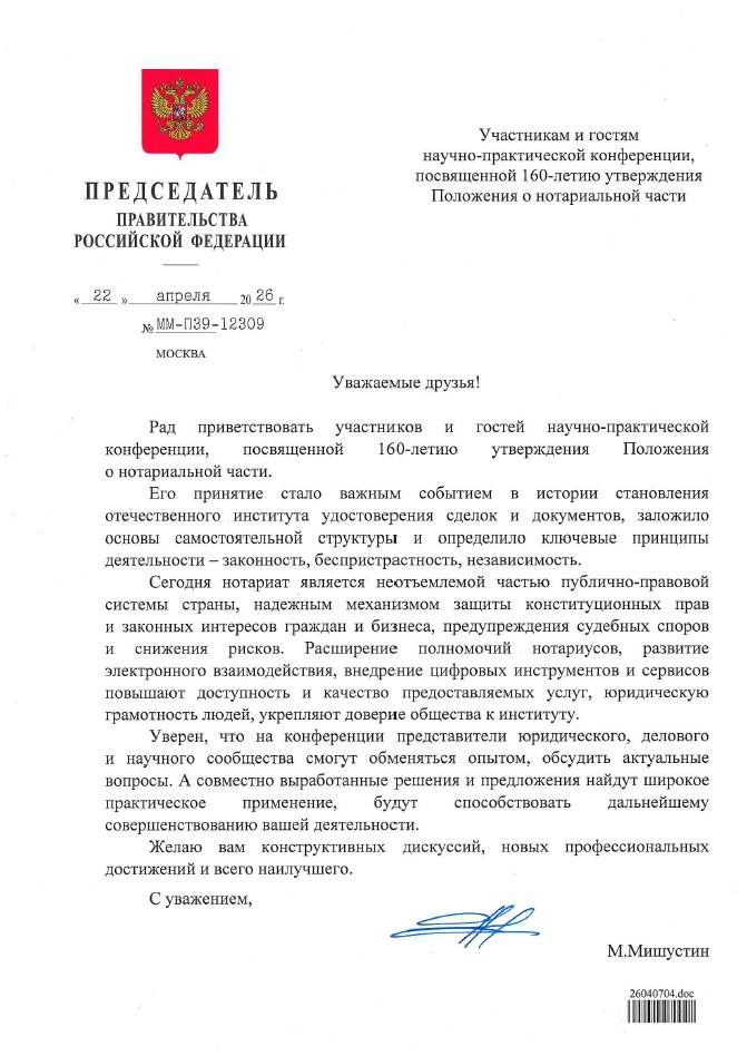 Ровно 160 лет назад, в 1866 году, император Александр II утвердил Положение о нотариальной части. С этого документа началась история нотариата как самостоятельного публично-правового института. В честь знаменательной даты первые лица государства выступили с официальными поздравлениями в адрес нотариального сообщества. В этом материале — тексты обращений от президента, премьер-министра, глав профильных ведомств и других представителей власти и должностных лиц.
