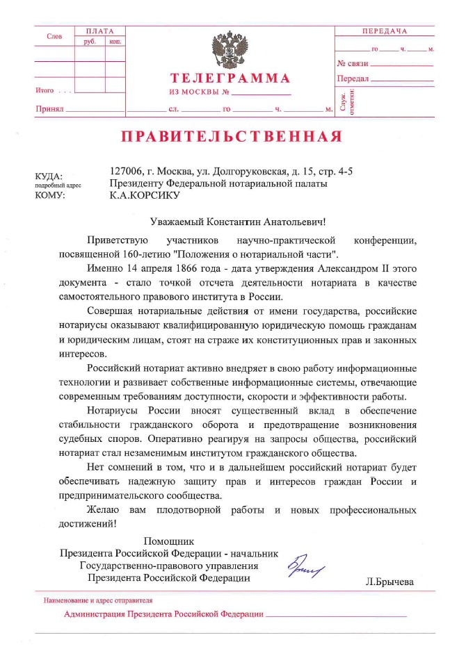 Существенный вклад нотариата в обеспечение стабильности гражданского оборота и предотвращение судебных споров отметила в своем поздравлении помощник Президента РФ — начальник Государственно-правового управления Президента РФ Лариса Брычева.